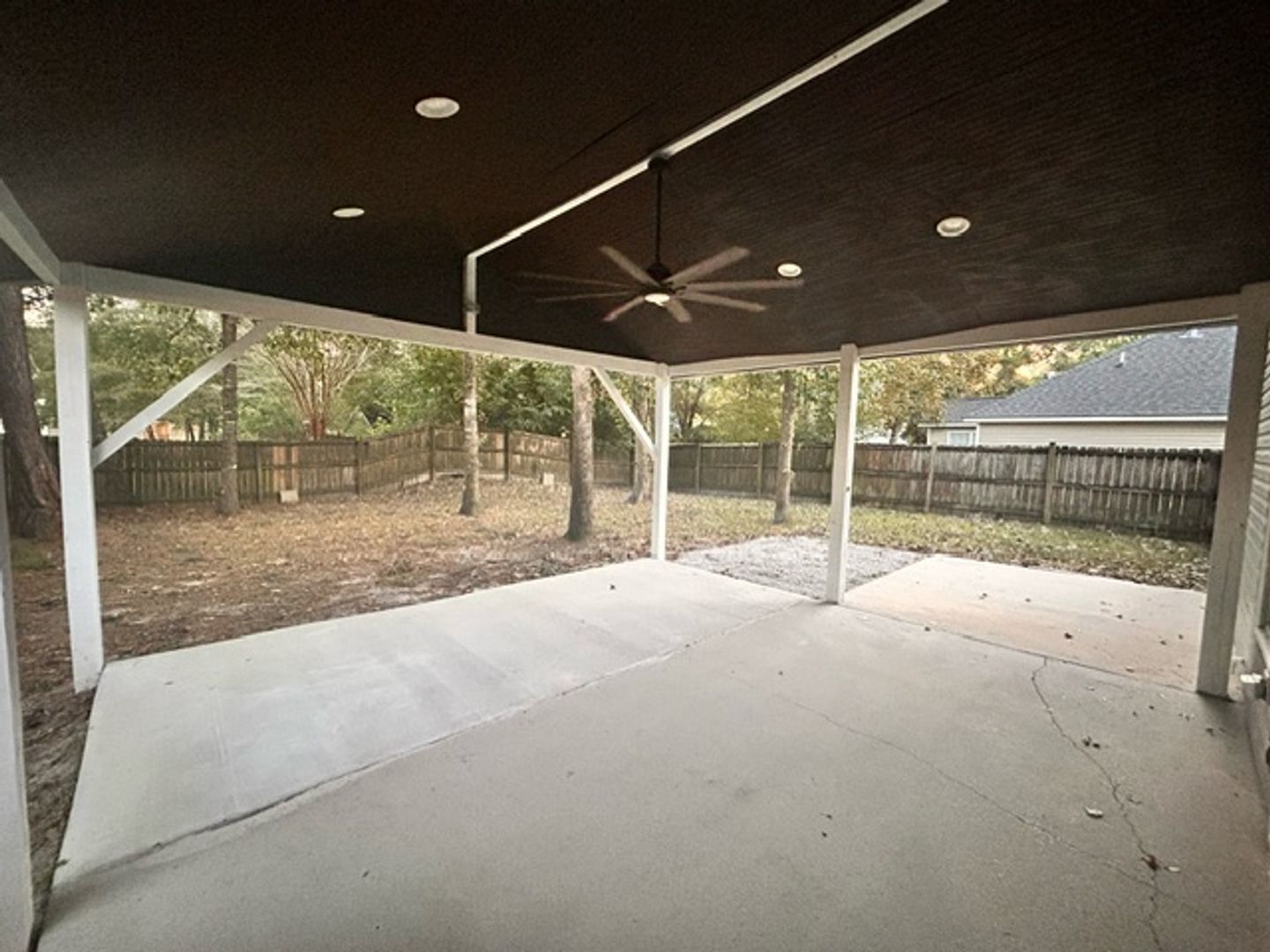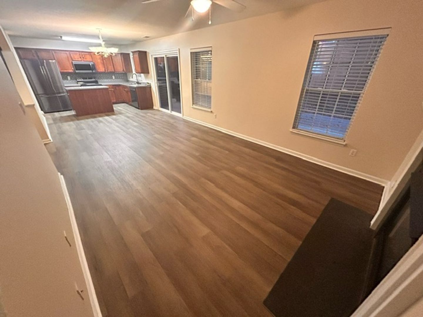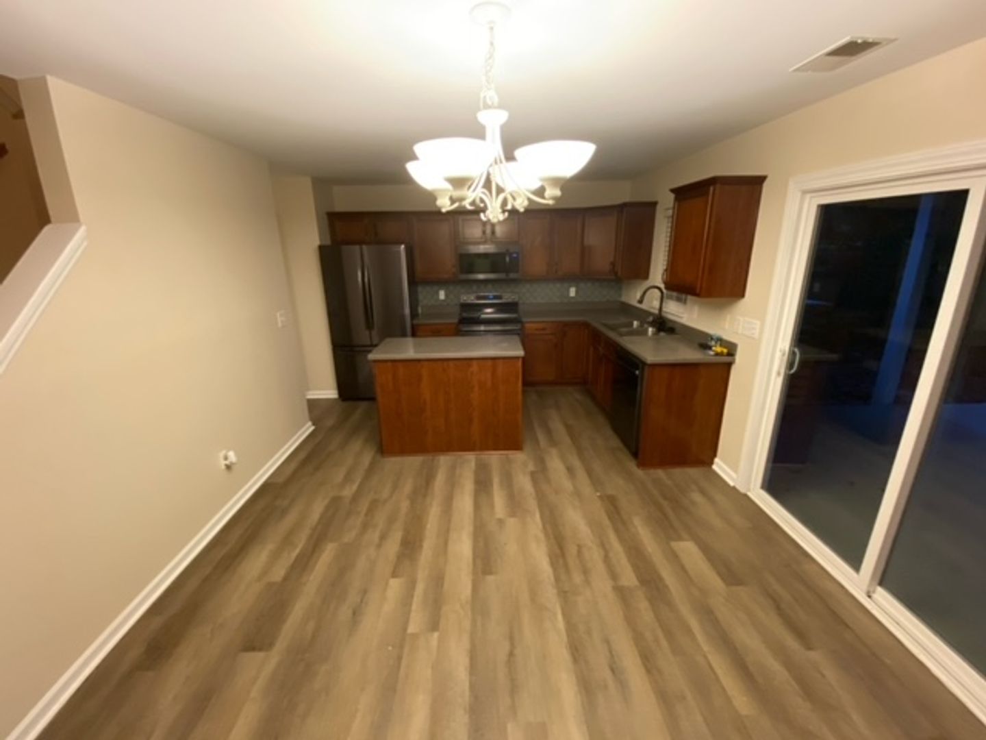This beautifully updated home features new laminate floors downstairs and fresh paint in every room. Enjoy a spacious 18' x 18' covered patio and a 9' x 12' open patio, perfect for entertaining friends or hosting football weekend cookouts in the privacy of your fenced backyard, which backs to a common area. The open eat-in kitchen boasts Corian countertops, a center island, and a view into the Great Room with a cozy gas log fireplace. It’s equipped with newer black stainless-steel appliances, including a French door fridge, dishwasher, microwave, and a smooth-top stove with traditional convection and air frying. A separate dining room at the front of the home connects to the kitchen via a hallway, with the pantry and extra storage under the stairwell for all your small appliances.