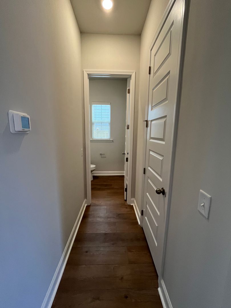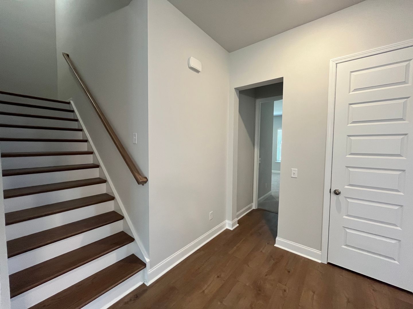 The main living areas on the first floor are complete with beautiful LVP flooring. The kitchen is equipped with white shaker-style cabinets, a subway tile backsplash, a large island with shiplap surround, a spacious walk-in pantry, and stainless-steel appliances, including a hood vent, gas cooktop, built-in microwave, and oven. The first-floor owner's suite offers a large en suite bath with a fully tiled walk-in shower that includes a bench seat and rain showerhead, dual sinks, a water closet, a walk-in closet, and a laundry closet designed for a stackable washer and dryer.