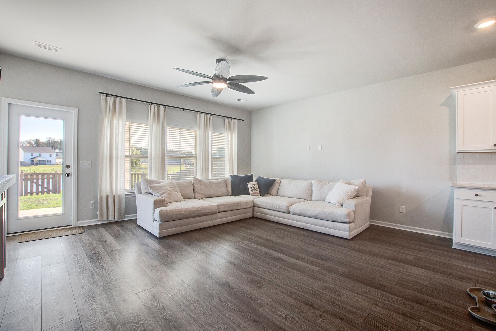 The home features a welcoming front porch, a two-car garage, and a bright foyer that flows seamlessly into the heart of the home. The open-concept kitchen and dining area are ideal for entertaining, featuring a large island with bar seating and a generous pantry. The adjacent family room provides a comfortable gathering space with abundant natural light. For outdoor living, a large, covered patio extends from the main living area.