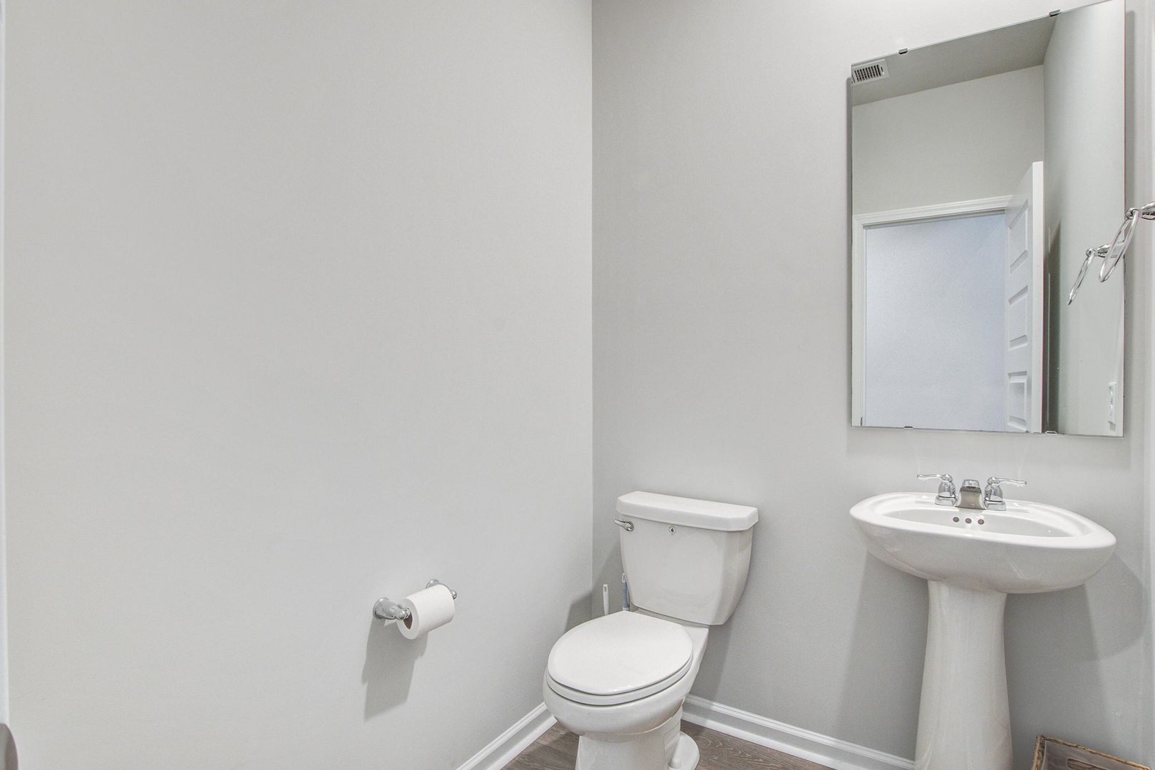 The primary suite is conveniently located on the main floor, offering a private retreat with dual sinks, a walk-in shower, and the unique perk of dual laundry capability. Durable laminate flooring runs throughout the first floor for both style and functionality.
