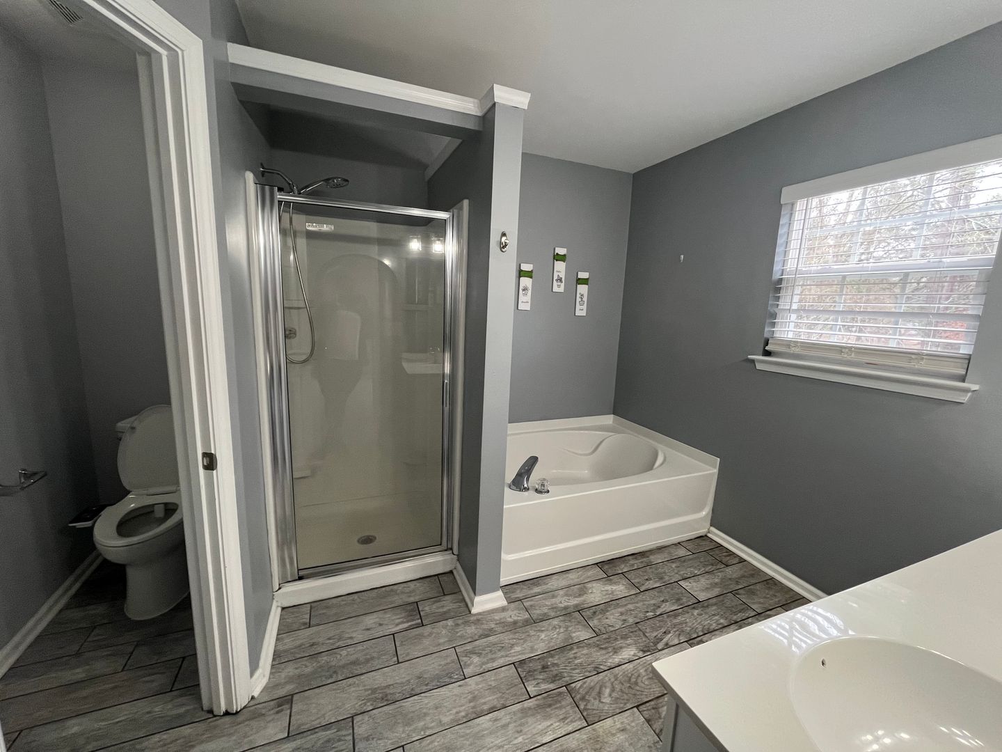 All four bedrooms are located upstairs. The spacious master suite includes a trey ceiling, a walk-in closet, and updated fixtures. The master bathroom features a dual vanity with a custom barn wood backsplash, wood-grain tile flooring, a garden tub, and a separate shower. The additional guest bedrooms, laundry room, and secondary bathroom are located further down the hall.